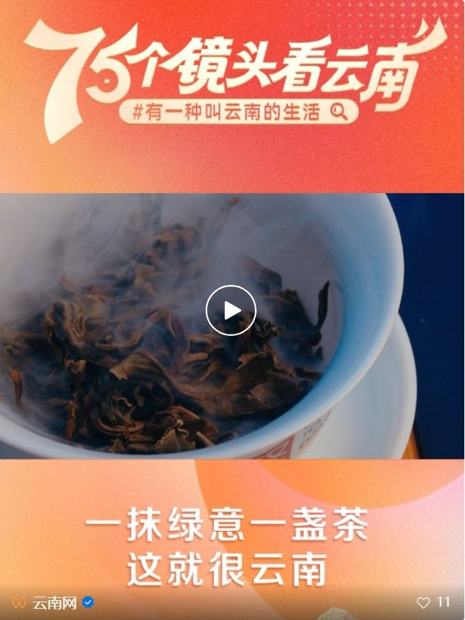 為獻(xiàn)禮中華人民共和國成立75周年,云南網(wǎng)聯(lián)合云南發(fā)布、“學(xué)習(xí)強(qiáng)國”云南學(xué)習(xí)平臺共同策劃推出“喜迎新中國成立75周年 75個鏡頭帶你看云南”融媒專欄,在7月18日至9月30日期間,一天一推,連續(xù)推出75條短視頻,聚焦最具云南味兒的山、水、風(fēng)、物、人,用細(xì)膩鏡頭、新穎表達(dá)、明快節(jié)奏、酷炫畫面,再現(xiàn)最奇特的山水風(fēng)光、最地道的民族風(fēng)情、最深厚的文化底蘊(yùn)、最絢麗的民間藝術(shù)、最原汁原味的美食,全方位展現(xiàn)“有一種叫云南的生活”。今天,請看第五十七期——《一抹綠意一盞茶,這就很云南》。
