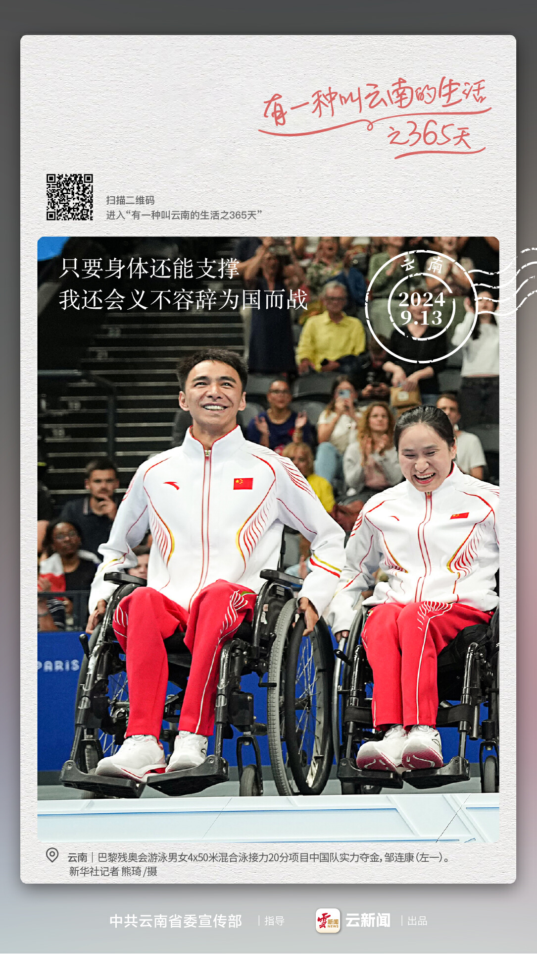 鄒連康1995年出生于云南曲靖,先后參加了里約殘奧會、東京殘奧會、巴黎殘奧會,是殘奧會的“三朝元老”?!爸灰业纳眢w還能支撐我有好的競技狀態(tài),我還會義不容辭為國而戰(zhàn)?!编u連康說。