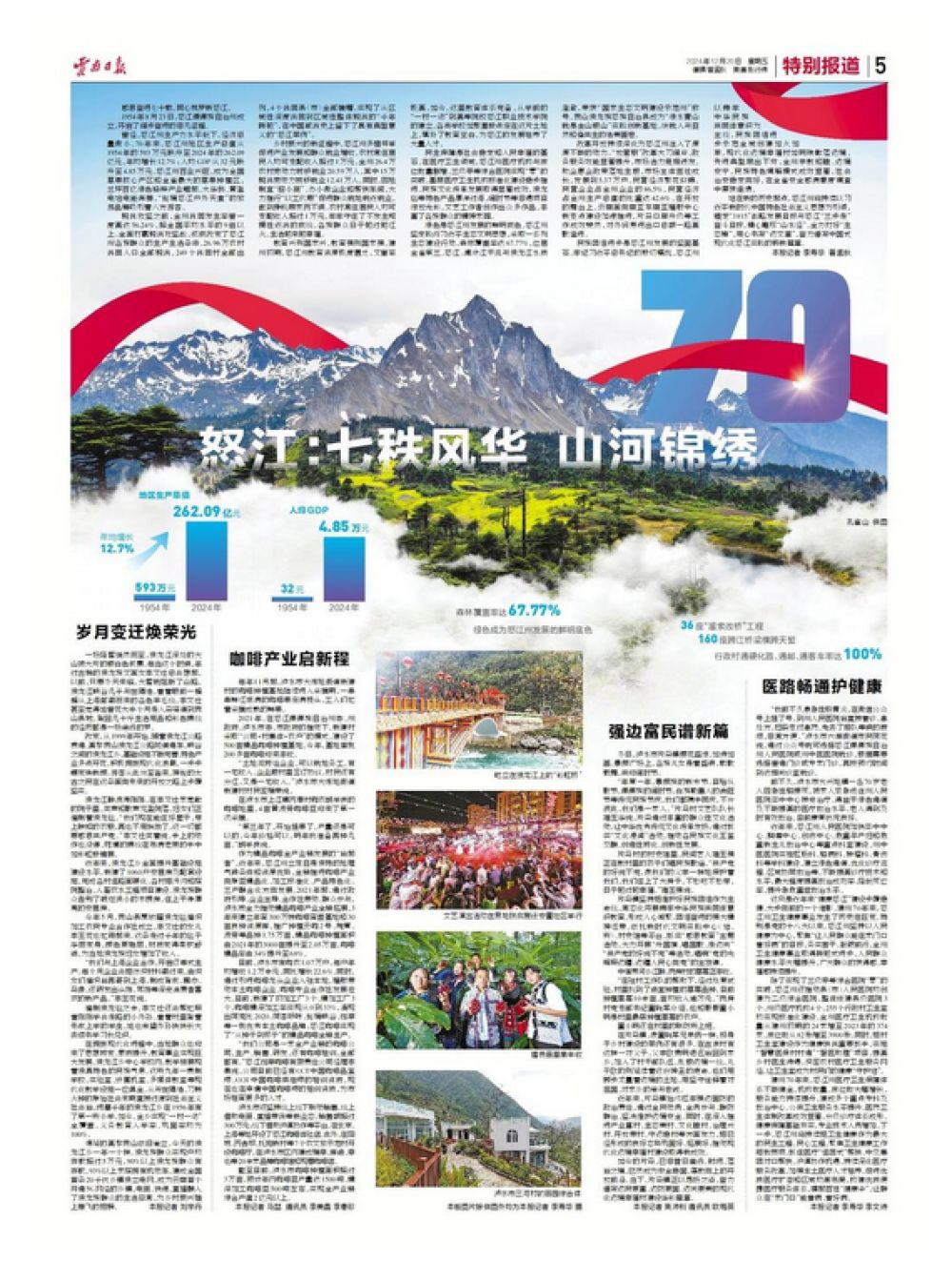 感恩奮進(jìn)七十載,同心筑夢新怒江。 1954年8月23日,怒江傈僳族自治州成立,開啟了闊步奮進(jìn)的非凡征程。 曾經(jīng),怒江州生產(chǎn)力水平低下,經(jīng)濟(jì)總量微小。70年來,怒江州地區(qū)生產(chǎn)總值從1954年的593萬元躍升至2024年的262.09億元,年均增長12.7%;人均GDP從32元躍升至4.85萬元。怒江州百業(yè)興旺,成為全國草果核心產(chǎn)區(qū)和全省最大的草果種植區(qū),蘭坪百億綠色鉛鋅產(chǎn)業(yè)崛起,大華橋、黃登電站電能奔騰,“秘境怒江戶外天堂”的旅游品牌吸引著八方游客。 脫貧攻堅(jiān)之前,全州貧困發(fā)生率曾一度高達(dá)56.24%,超全國平均水平的9倍以上。全面打贏脫貧攻堅(jiān)戰(zhàn),徹底改變了怒江州各族群眾的生產(chǎn)生活條件。26.96萬農(nóng)村貧困人口全部脫貧,249個(gè)貧困村全部出列,4個(gè)貧困縣(市)全部摘帽,實(shí)現(xiàn)了從區(qū)域性深度貧困到區(qū)域性整體脫貧的“千年跨越”,在中國減貧史上留下了具有典型意義的“怒江案例”。 鄉(xiāng)村振興的新征程中,怒江州多措并舉促進(jìn)產(chǎn)業(yè)發(fā)展和群眾就業(yè)增收,農(nóng)村常住居民人均可支配收入超過1萬元。全州26.4萬農(nóng)村勞動力轉(zhuǎn)移就業(yè)20.59萬人,其中15萬脫貧勞動力轉(zhuǎn)移就業(yè)12.41萬人。同時(shí),因地制宜“招小商”、辦小微企業(yè)和幫扶車間,大力推行“以工代賑”促進(jìn)群眾就地就近就業(yè),做到掙錢顧家兩不誤。農(nóng)村常住居民人均可支配收入超過1萬元,牢牢守住了不發(fā)生規(guī)模性返貧的底線,各族群眾日子越過越紅火,生活越來越幸福。 教育興則國家興,教育強(qiáng)則國家強(qiáng)。建州初期,怒江州教育資源極度匱乏,文盲率極高。如今,這里教育體系完備,從學(xué)前的“一村一幼”到高等院校怒江職業(yè)技術(shù)學(xué)院的建立,各類學(xué)校如繁星般點(diǎn)綴在這片土地上,填補(bǔ)了教育空白,為怒江的發(fā)展培養(yǎng)了大量人才。 民生保障是社會穩(wěn)定和人民幸福的基石。在醫(yī)療衛(wèi)生領(lǐng)域,怒江州醫(yī)療機(jī)構(gòu)與床位數(shù)量劇增,三級甲等綜合醫(yī)院實(shí)現(xiàn)“零”的突破,基層醫(yī)療衛(wèi)生機(jī)構(gòu)標(biāo)準(zhǔn)化建設(shè)穩(wěn)步推進(jìn)。民族文化傳承發(fā)展取得顯著成效,獨(dú)龍?zhí)旱忍厣a(chǎn)品漂洋過海,闊時(shí)節(jié)等非遺項(xiàng)目綻放光彩,文藝工作者創(chuàng)作出眾多作品,豐富了各族群眾的精神家園。 綠色是怒江州發(fā)展的鮮明底色。怒江州堅(jiān)定踐行習(xí)近平生態(tài)文明思想,采取一系列生態(tài)建設(shè)行動,森林覆蓋率達(dá)67.77%,位居全省第三。怒江、瀾滄江干流與獨(dú)龍江水質(zhì)澄澈,榮獲“國家生態(tài)文明建設(shè)示范州”稱號,貢山獨(dú)龍族怒族自治縣成為“綠水青山就是金山銀山”實(shí)踐創(chuàng)新基地,繪就人與自然和諧共生的絕美畫卷。 改革開放持續(xù)深化為怒江州注入了源源不斷的動力?!胺殴芊备母锎蟮堕煾?,政務(wù)服務(wù)效能顯著提升,市場活力競相迸發(fā)。助企惠企政策落地生根,市場主體茁壯成長,發(fā)展到5.37萬戶。民營經(jīng)濟(jì)繁花似錦,民營企業(yè)占全州企業(yè)的86.5%,民營經(jīng)濟(jì)占全州生產(chǎn)總值的比重達(dá)42.6%。在開放的舞臺上,云南面向南亞東南亞輻射中心新支點(diǎn)建設(shè)加速推進(jìn),片馬口岸升級等工作成效斐然,對外貿(mào)易進(jìn)出口總額一路高歌猛進(jìn)。 民族團(tuán)結(jié)進(jìn)步是怒江州發(fā)展的堅(jiān)固基石。牢記習(xí)近平總書記的殷切囑托,怒江州以鑄牢中華民族共同體意識為主線,民族團(tuán)結(jié)進(jìn)步示范全域創(chuàng)建如火如荼,現(xiàn)代化邊境幸福村如明珠散落邊境,先進(jìn)典型層出不窮。全州宗教和睦、邊境安寧,民族特色調(diào)解模式成效顯著,社會治安穩(wěn)定向好,在全省安全感滿意度調(diào)查中屢獲佳績。 站在新的歷史起點(diǎn),怒江州將持續(xù)以習(xí)近平新時(shí)代中國特色社會主義思想為引領(lǐng),錨定“3815”戰(zhàn)略發(fā)展目標(biāo)與怒江“三步走”奮斗目標(biāo),精心雕琢“山水經(jīng)”,全力打好“生態(tài)牌”,用心書寫“邊文章”,奮力譜寫中國式現(xiàn)代化怒江實(shí)踐的嶄新篇章。