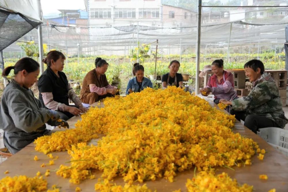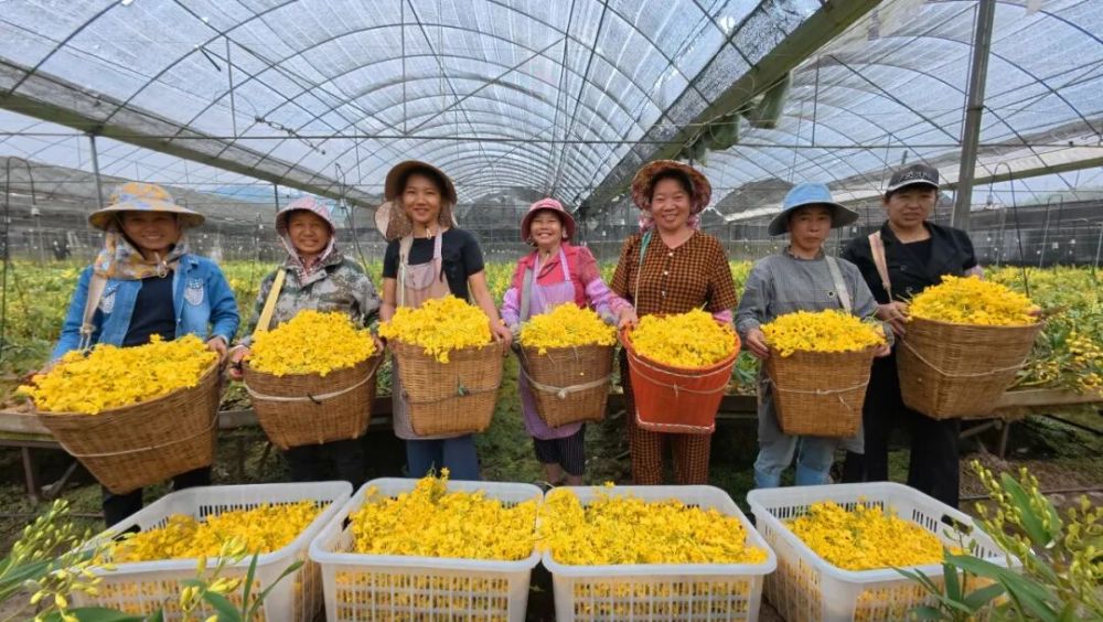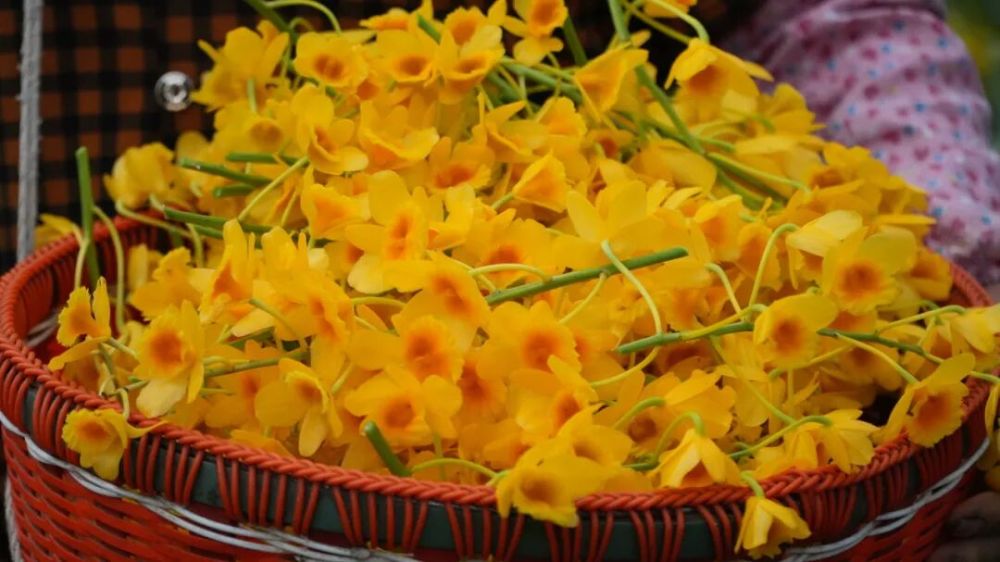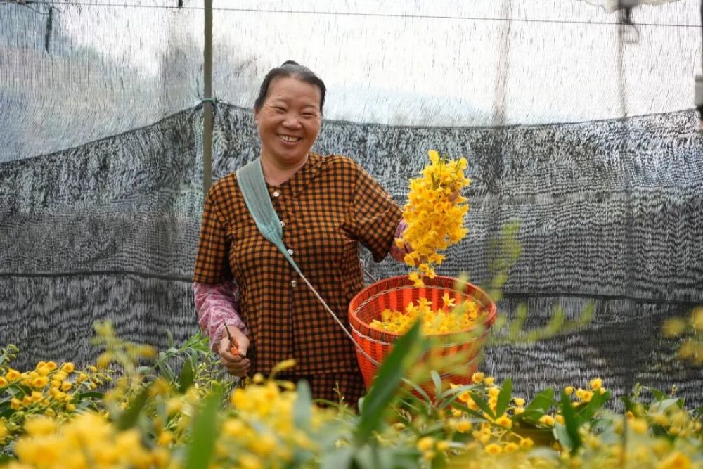 花叢間,工人們手持剪刀嫻熟穿梭,“咔嗒”“咔嗒”的剪切聲此起彼伏,一朵朵金黃嬌艷的鼓槌石斛花落入背簍,不一會兒便壘起層層金黃。