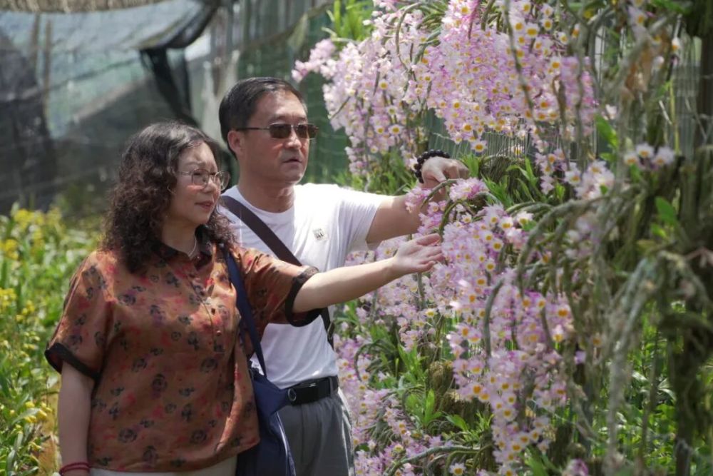 游客漫步花間,在石斛花海里感受春日芬芳。