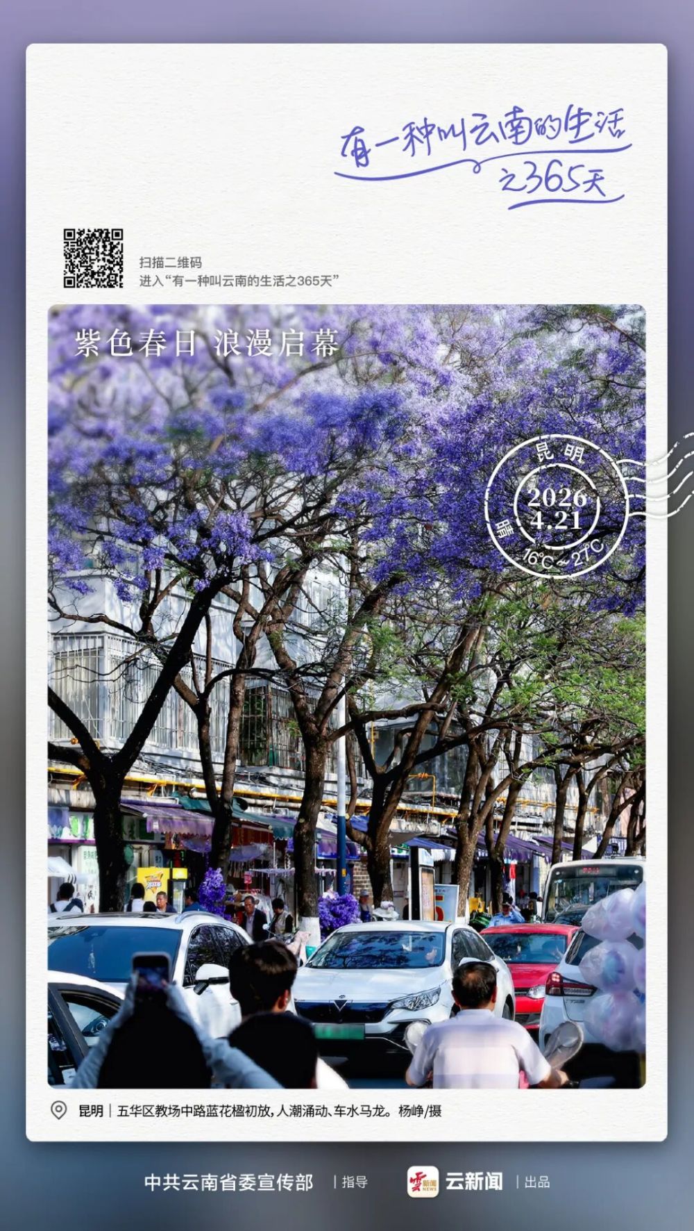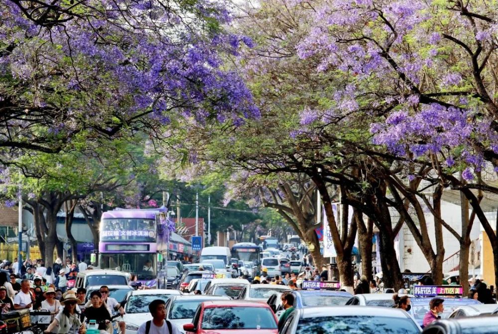 教場中路藍花楹初放,整條街區(qū)人潮涌動、車水馬龍。記者 楊崢 攝