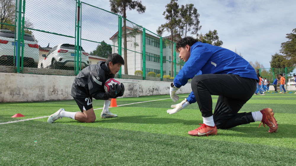 古城足球?qū)W校教練指導(dǎo)麗江特殊教育學(xué)校球隊守門員。(麗江融媒記者 高浚 攝)