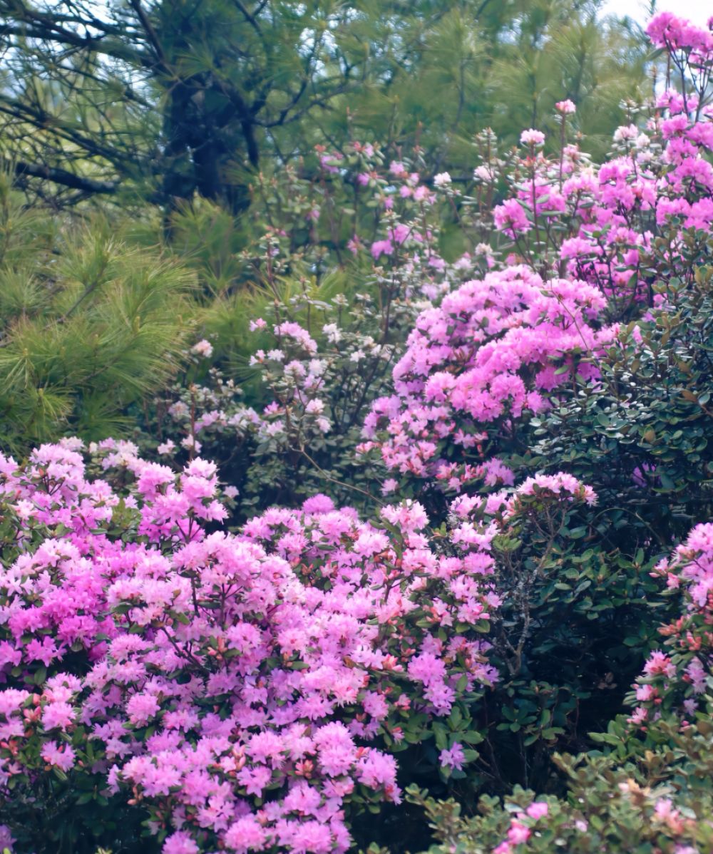 往山林深處望去,是另一番天地。成片的粉紫色小杜鵑鋪成了花的地毯,從山腳一直蔓延到山頂,像給大地蓋了一層朦朧的紫霧。高大的云南松筆挺地立在其間,深褐的樹干、蒼勁的枝丫,襯得粉杜鵑的紫愈發(fā)清淺。風(fēng)穿過松濤,帶著松針的清香和山花的甜潤(rùn),在林間穿梭,把一整個(gè)春天的生機(jī)都揉進(jìn)了麗江的山野里。